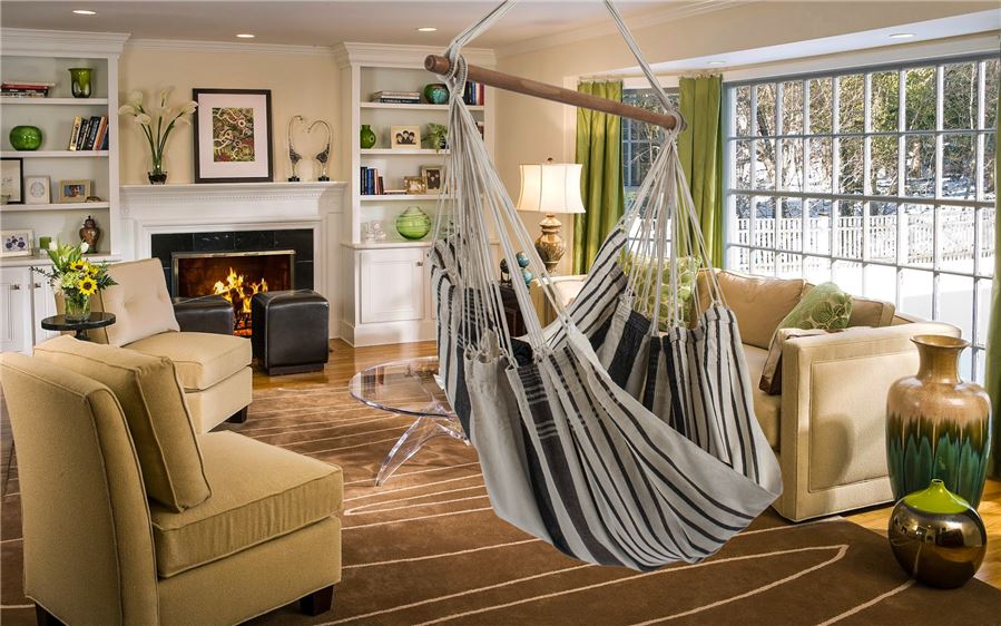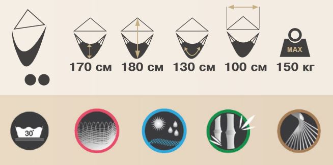 Подвесное кресло-гамак с деревянной перекладиной. Выдерживаемая нагрузка до 150 кг. Полотно изготовлено из прочной ткани, устойчивой к выцветанию, хорошо переносящей чистку и стирку.