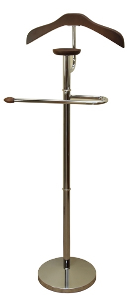 Вешалка напольная GC 1519, изящная, стильная вешалка для костюма. Установлена вешалка на утяжеленном основании диаметром 28 см. Ширина плечиков 45 см, имеется чашечка для мелочей и вешалка для брюк. Стойка вешалки выполнена из хромированного металла. Плечики и чашечка для мелочей из МДФ, в цвете темный орех.